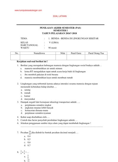 39.bisa, yakni dengan membuang sampah pada . Soal pas kelas 5 tema 1 k13 dan kunci jawaban, download soal uas kelas v sd/mi tema 1 kurikulum 2013 revisi terbaru tahun 2020/2021. Contoh soal ulangan akhir semester (uas/pas). Kegiatan penilaian pendidikan dalam bentuk uas / pas diharapkan dimulai seperti biasa untuk semester pertama pada awal desember, sehingga guru dapat . Soal uas 1 penilaian akhir semester kelas 5 sd tema 1 k13 (bagian ii) ini untuk membantu belajar peserta didik kelas 5 sd dalam menghadapi .